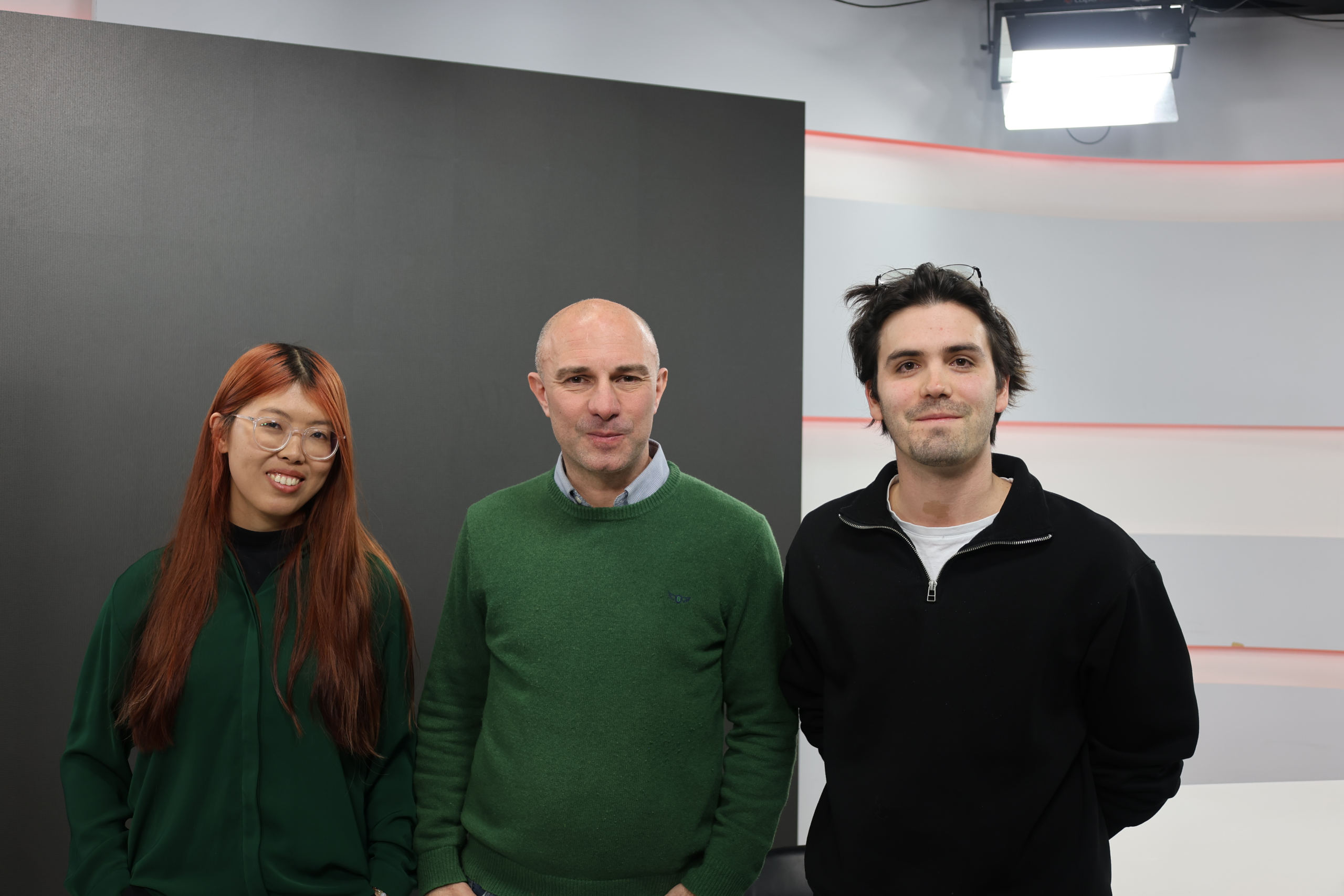 Han Jiaxuan,Jorge Sánchez y Luken Álvarez, en el plató de TV de Europea Media. FOTO: Nicolás Morata